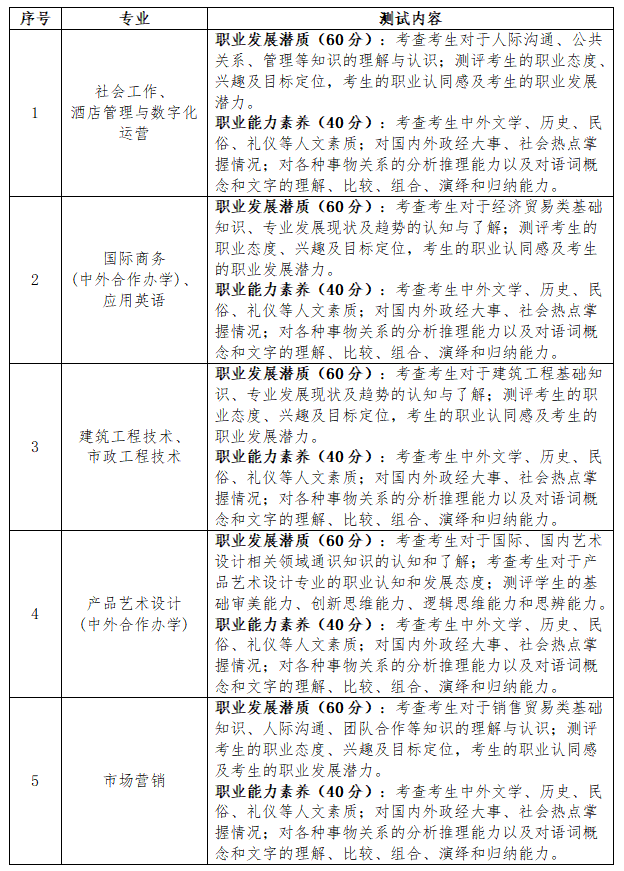 根据专业和考生类别,测试形式分为职业性向测试(笔试、闭卷)、语数文化测试(笔试、闭卷)两类。
